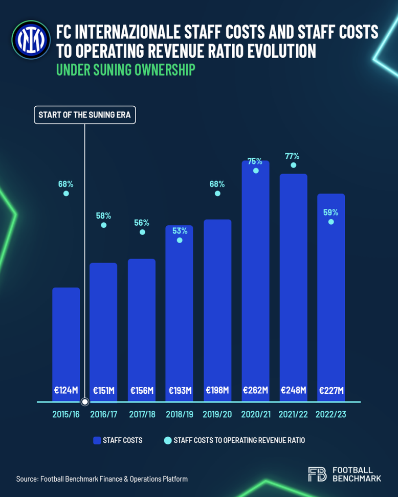 Dal lato delle spese, dal 2016/17, i costi del personale sono aumentati costantemente, raggiungendo il picco di 262 milioni di euro nella stagione 2020/21. Tuttavia, questa tendenza si è invertita nelle ultime due stagioni, con i costi totali del personale in calo del 13%, fino a 227 milioni di euro nel 2022/23. Questa riduzione è stata in parte dovuta alle cessioni di giocatori di alto profilo come Lukaku e Hakimi.