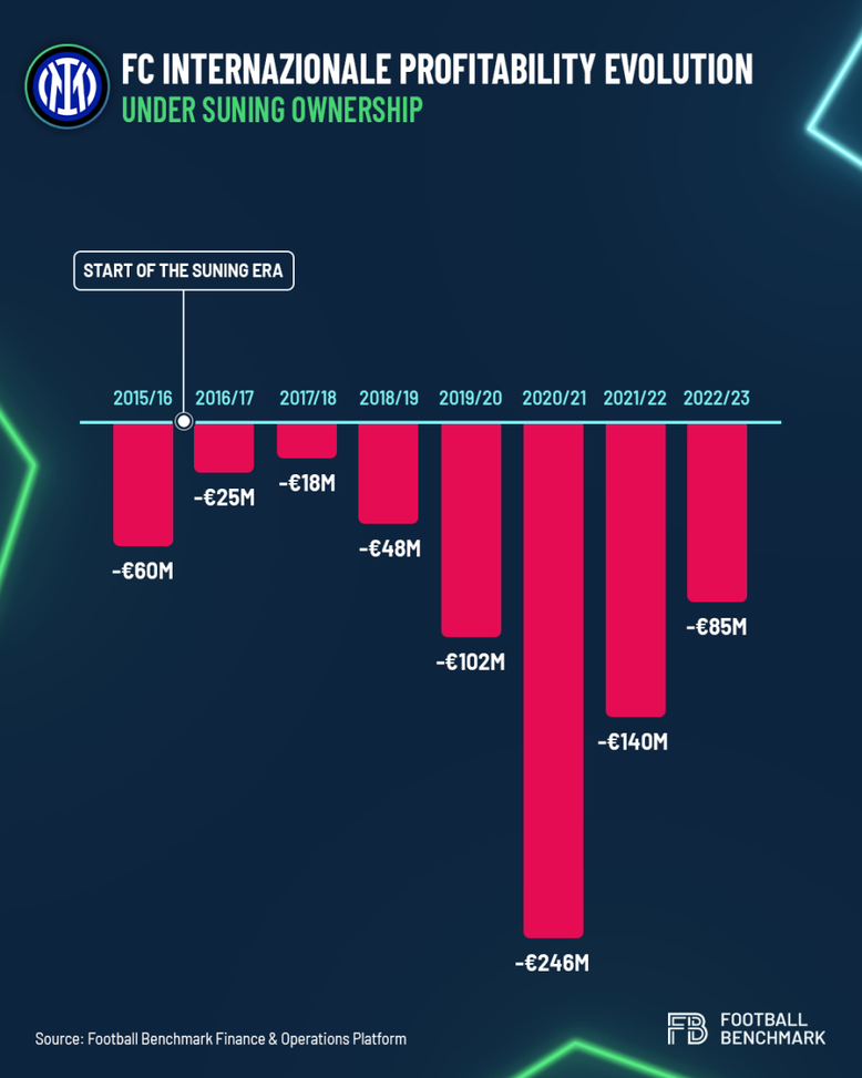 Per quanto riguarda la redditività del club, l'Inter ha registrato una perdita netta cumulativa di 724 milioni di euro nelle ultime otto stagioni. Dall'arrivo di Suning, l'Inter ha sempre chiuso ogni stagione in rosso. La perdita di 246 milioni di euro registrata nel 2020/21 è la più alta di sempre per un club di Serie A. Tuttavia, grazie all’aumento dei ricavi, al risparmio sui costi del personale e ai ricavi derivanti dallo scambio di giocatori, la perdita annuale è stata significativamente ridotta a 85 milioni di euro nel 2022/23.