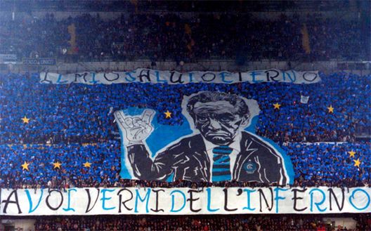 È la coreografia in onore dell’avvocato Peppino Prisco, scomparso un anno prima, che la Curva Nord dedica ai cugini del Milan.