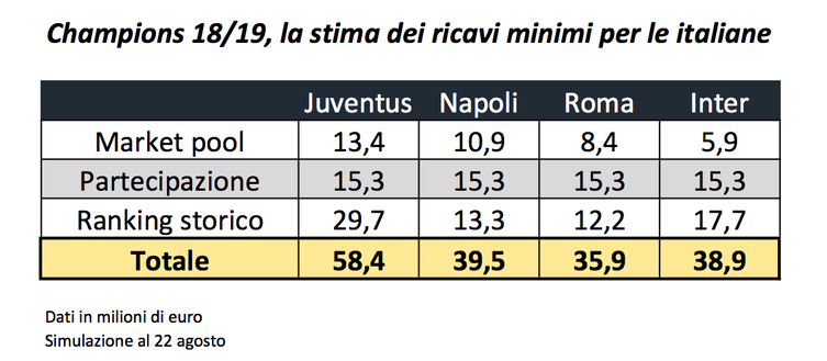 La quota più bassa, per l'Inter, riguarda il market pool, che dipende dal valore dei diritti tv e per il 50% riguarda il piazzamento nella scorsa Serie A: l'Inter ha la quota più bassa essendo arrivata quarta.