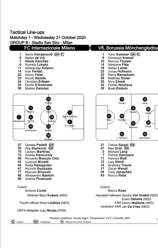 BORUSSIA MÖNCHENGLADBACH (3-4-1-2): 1 Sommer; 28 Ginter, 30 Elvedi, 25 Bensebaini; 18 Lainer, 6 Kramer, 32 Neuhaus, 36; 23 J. Hoffman; 10 Thuram, 14 Pléa.