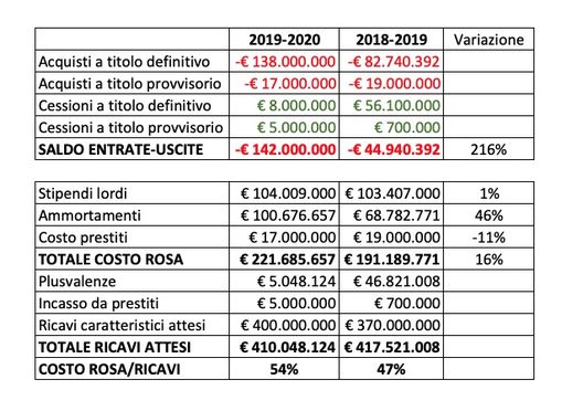 Partiamo dalla fine. Il confronto che fa, ottimamente, Calcio e Finanza sull'impatto dell'ultimo mercato sulle big: la bilancia costi/ricavi, per l'Inter, si ferma ad un tranquillizzante 54% mentre la Juve è tra il 69 e il 72% e il Milan addirittura all'83%, ben al di sopra della soglia di sicurezza Uefa.