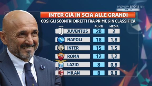 Grazie alla vittoria esterna contro la Lazio, l'Inter ha strappato l'accesso alla prossima Champions League. Un traguardo cercato, sognato, sperato e raggiunto proprio all'ultima giornata, ribaltando l'incontro nel quarto d'ora finale quando tutto sembrava perduto. Con i tre punti maturati all'Olimpico, la squadra di Spalletti conferma l'ottimo trend con le big mostrato durante l'intero campionato. Analizzando i confronti diretti con le prime sei della classe, l'Inter vanta uno score di 15 punti (4 contro Milan, Roma e Lazio, 2 con il Napoli ed 1 con la Juventus) in 10 partite. Un risultato che proietta l'Inter al terzo posto di questa speciale classifica con Napoli (18) e Juventus (20) davanti a tutte. Negli scontri diretti, l'Inter ha sempre dato il meglio di sé, venendo sconfitta solamente contro la Juventus al termine di un match intriso di polemica per la gestione arbitrale di Orsato. Un ottimo risultato globale da cui ripartire per l'Inter che verrà, con Spalletti saldamente al timone.