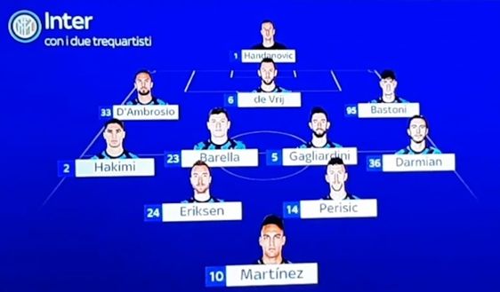L'altra possibilità è quella di passare al 3-4-2-1 e schierare due trequartisti di supporto a Lautaro. Con questo assetto, Conte potrebbe dare spazio a Eriksen e Perisic alle spalle dell'argentino e a sinsitra dovrebbe giocare Darmian.