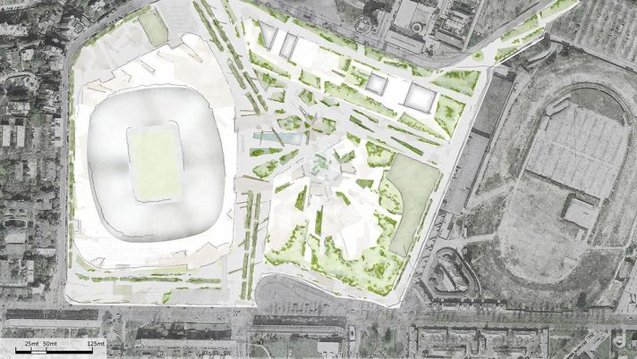 La documentazione depositata oggi dai Club, per la sua natura di 'Progetto di Fattibilità', è una pianificazione urbanistica dell'area che comprende ipotesi di funzioni senza alcuna definizione architettonica né per lo stadio né per il distretto multifunzionale.