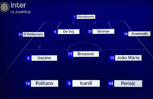 L'Inter, invece, dovrebbe scendere in campo con un 4-3-3 con Icardi ovviamente punta centrale e aiutato da Perisic e Politano sulle fasce. Dovrebbe dunque partire dalla panchina Keita Balde, autore di due ottime prestazioni in campionato contro Frosinone e Roma. A centrocampo torna Brozovic davanti alla difesa: i muscoli nerazzurri nel mezzo verranno aumentati da Vecino. A completare il reparto, ecco Joao Mario, favorito su Gagliardini e Borja Valero. Pochi dubbi in difesa: Vrsaljko non è ancora al meglio e dunque lascerà spazio a D'Ambrosio, mentre sull'altra fascia agirà l'ex bianconero Asamoah, che torna per la prima volta allo Stadium. Skriniar e de Vrij coppia centrale davanti ad Handanovic.