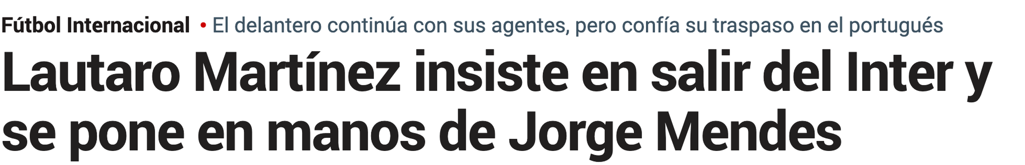 Secondo quanto si legge sul portale spagnolo Marca, il Toro avrebbe espresso il desiderio di lasciare l'Inter nella prossima stagione. L'argentino vorrebbe un grande club dove poter avere maggiori possibilità di conquistare trofei. Per questo Lautaro starebbe valutando la possibilità di affidare la sua uscita dall'Inter a Jorge Mendes che non sarà il suo agente, ma quello che si occuperà di questo delicato trasferimento.