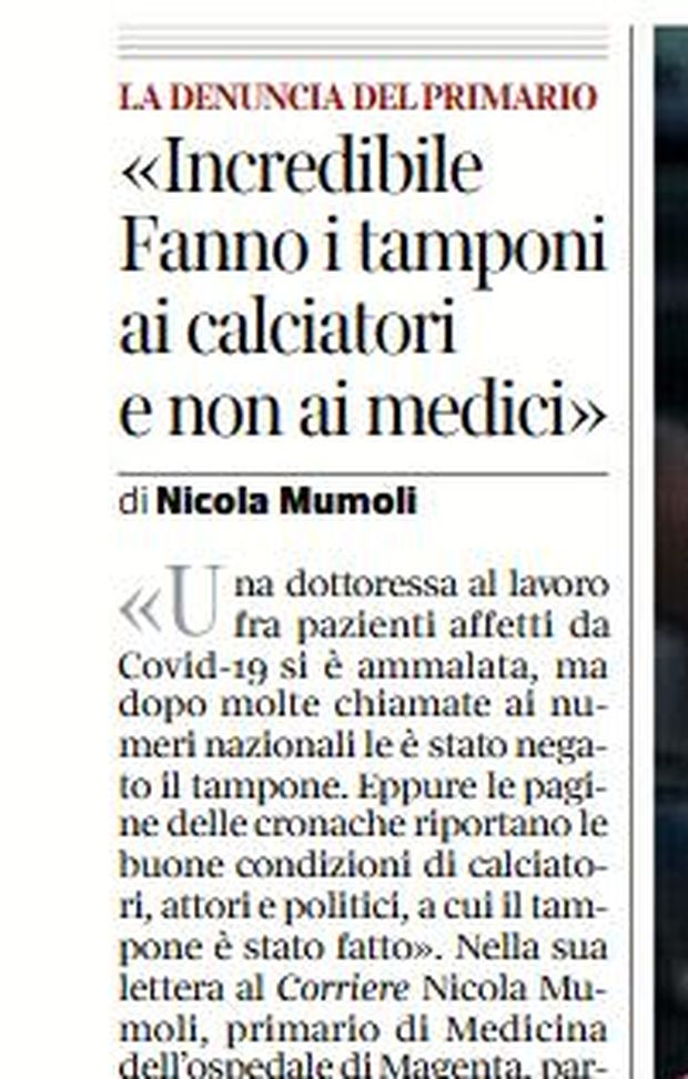 Una lettera durissima. L'ha pubblicata il Corriere della Sera a firma Nicola Mumoli, direttore di Medicina Interna dell'Ospedale di Magenta, in Lombardia. Una lettera che attacca il comportamento discriminatorio in merito ai tamponi.