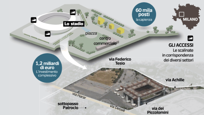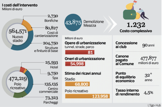 Partiamo dal costo totale: 1,23 miliardi. L'investimento verrà realizzato con un finanziamento che coprirà il 90 per cento dell'investimento con una durata di 30 anni e un interesse del 5 per cento annuo. Il miliardo e 23 milioni è diviso così: 564 per i lavori del comparto stadio (tra cui 2,7 milioni per le bonifiche, 204 per la struttura e la finitura di base, 80 per i costi di cantierizzazione, 48 per gli arredi fissi); 472 milioni per i lavori del comparto multifunzionale (tra cui 25,5 milioni per la costruzione dell' hotel, 106 per gli uffici, 135 per il centro commerciale). A questi si devono aggiungere i costi per la demolizione del Meazza pari 43 milioni e 875 mila euro e le opere di urbanizzazione primaria e secondaria, che significano strade, svincoli, reti gas, acqua, luce, parchi, piazze, ciclabili, parcheggi. La cifra arriva a 81 milioni e 237 mila euro. I due club intendono procedere con l'esecuzione diretta delle opere a scomputo degli oneri di urbanizzazione pari a 55 milioni. La differenza supera i 26,2 milioni di euro. L'altro numero da aggiungere riguarda i costi di costruzione pari a 31,4 milioni di euro, soldi che però potrebbero essere scomputati con la realizzazione di opere".