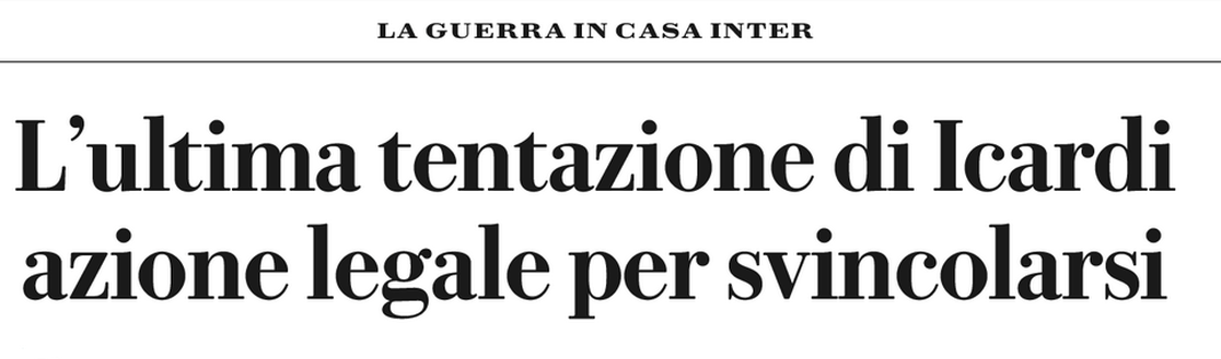 Il quotidiano in edicola oggi riporta "Nella guerra fredda fra Mauro Icardi e l’Inter, entra per la prima volta la minaccia atomica. Il giocatore potrebbe chiedere al collegio arbitrale della Serie A la risoluzione del suo contratto con i nerazzurri, valido fino al 30 giugno 2021. Contatti preliminari fra lo staff del giocatore e legali esperti in diritto del lavoro sono già avviati.