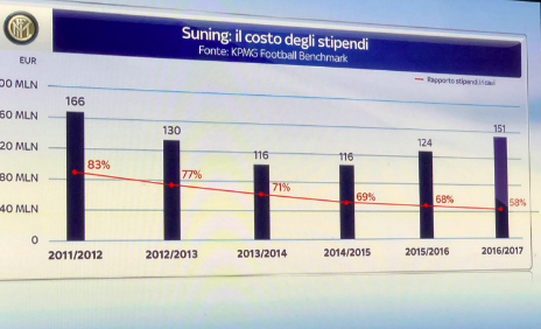 "L'incidenza della squadra sul fatturato è andata sempre diminuendo, per anni al di sotto del 70% parametro raccomandato dalla Uefa. In valori assoluti sono aumentati e hanno avvistato su parco giocatori importanti. Nel bilancio 2016/17 l'Inter aveva 4 allenatori in busta paga.