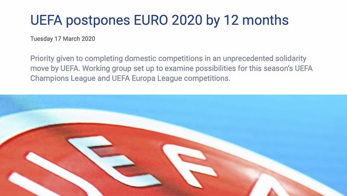 "La UEFA ha annunciato oggi il rinvio di EURO 2020". Apre così il comunicato dell'organo europeo sul proprio sito ufficiale, che riporta l'esito della riunione svoltasi nella giornata di oggi. "