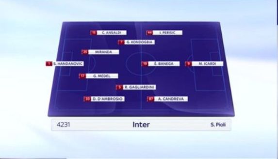 (4-2-3-1: Handanovic; D'Ambrosio, Medel, Miranda, Ansaldi; Gagliardini, Kondogbia; Candreva, Banega, Perisic; Icardi)