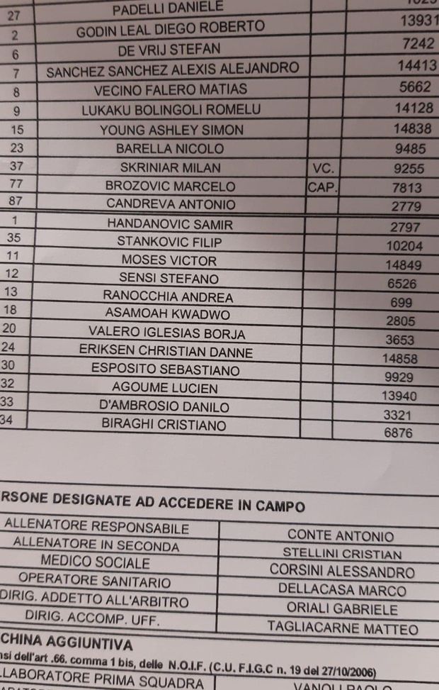 INTER (3-5-2): 27 Padelli; 2 Godin, 6 de Vrij, 37 Skriniar; 87 Candreva, 8 Vecino, 77 Brozovic, 23 Barella, 15 Young; 9 Lukaku, 7 Sanchez.