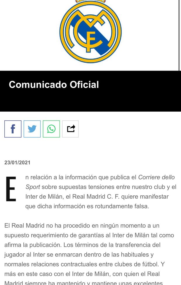 "In relazione all'informazione pubblicata oggi dal Corriere dello Sport su presunte tensioni tra il nostro club e l'Inter, il Real Madrid vuole evidenziare come questa informazione sia assolutamente falsa. Il Real Madrid non ha mai avanzato, in alcun momento, alcuna richiesta di garanzie nei confronti dell'Inter come sostiene il quotidiano. I termini di pagamento di Hakimi all'Inter fanno parte di normali e abituali relazioni contrattuali tra club. E ancor di più con l'Inter, club con cui il Real Madrid ha sempre mantenuto e mantiene rapporti eccellenti e club storico e amico".