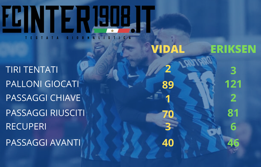 Se il cileno non dovesse recuperare potrebbe essere il danese il prescelto come mezzala sinistra. L'ex Tottenham ha ormai superato Gagliardini e Sensi come prima alternativa di Vidal, ma non è escluso che possa essere anche la prima scelta di Conte per il derby col Milan. Analizzando le ultime due partite da titolare di Vidal come mezzala sinistra (Udinese-Inter di campionato e Inter-Juve di Coppa Italia) e le ultime due dal 1' di Eriksen nello stesso ruolo (Juve-Inter di Coppa Italia e Inter-Lazio di Serie A) i numeri sono tutti in favore del danese. Nella tabella la somma dei dati relativi alle due partite dei due giocatori.