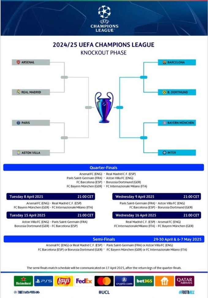 L'UEFA ha reso note data e orario delle sfide di andata e ritorno dei quarti di finale di Champions League