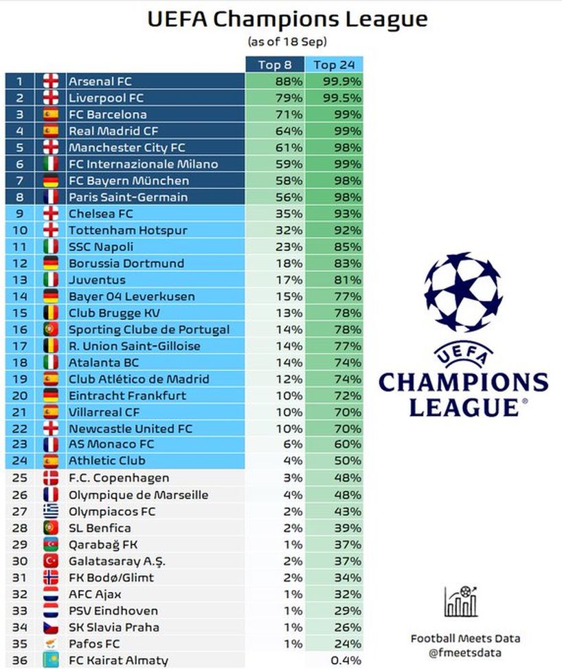 In sintesi: l’Inter si conferma nella ristretta élite europea, stimata al livello delle big inglesi e spagnole, con numeri migliori di Bayern Monaco e PSG. Le premesse sono quelle di una Champions in cui i nerazzurri possono recitare ancora una volta un ruolo da protagonisti. Importante, per la squadra di Chivu, fare 12 punti nelle prime 4 partite, che sono assolutamente alla portata prima dei 4 big match finali
