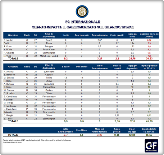 Non c'è solo il bilancio del 2014 al centro del cda di questa mattina. I dirigenti nerazzurri dovranno anche verificare quello che sarà l'impatto del calciomercato estivo sul bilancio del 2015, quello che si chiuderà il prossimo 30 giugno.