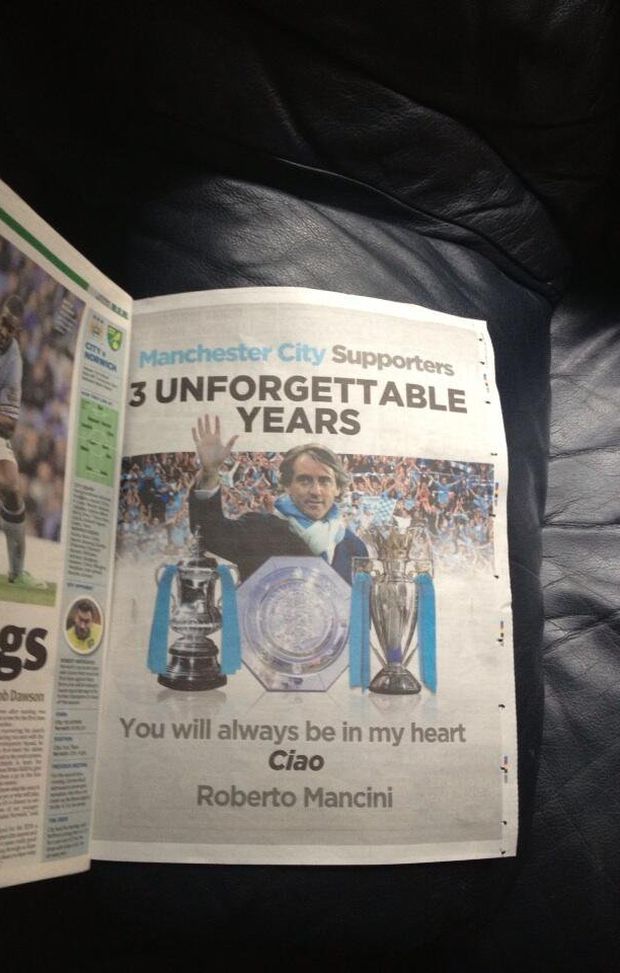 Tutto sommato, i tifosi del Manchester City a lui erano affezionati. Roberto Mancini, nonostante l’esonero, ha deciso di ringraziare lo stesso i suoi ex supporters acquistando un’intera pagina di quotidiano dedicandogli delle belle...