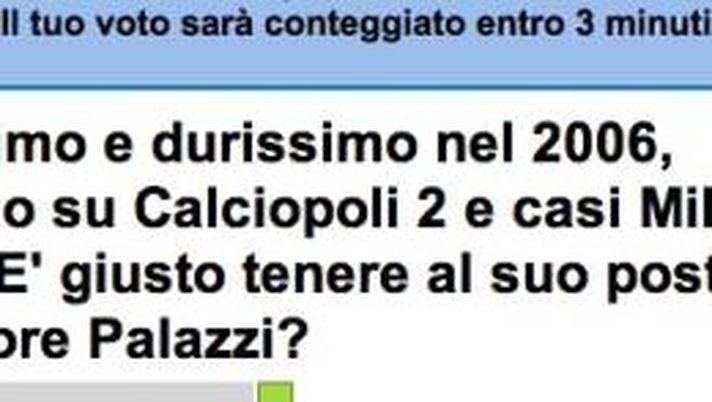 Se mai ce ne fosse bisogno, Tuttosport quest'oggi propone un sondaggio in cui si discute se sia giusto tenere al suo posto o meno il procuratore Stefano Palazzi. Il risultato è imbarazzante con un 94,7% di tifosi (juventini per lo più) contrari all'autorità data al pr per Calciopoli-bis.E' proprio il caso di parlare di "maggioranza bulgara"...
