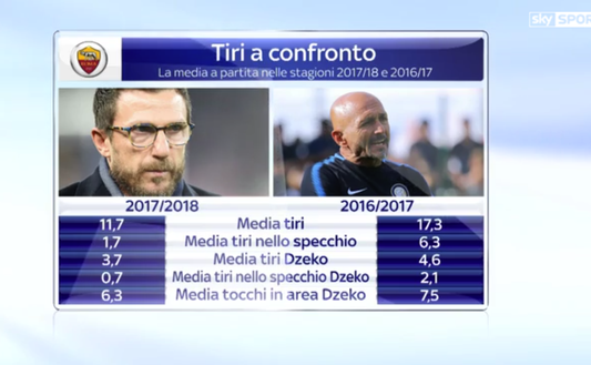 Per quanto riguarda la Roma, viene posto l'accento sulla fase offensiva attraverso un paragone tra i numeri di Eusebio Di Francesco - chiaramente dopo le prime uscite stagionali - e quelli di Luciano Spalletti.