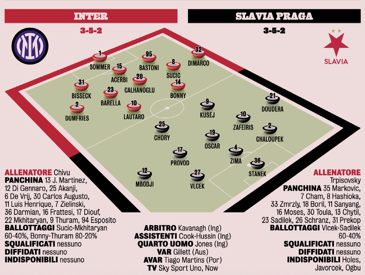 "L’Inter prosegue con il turnover scientifico: dentro Sommer portiere di coppa; riposo ad Akanji e De Vrij dietro, per non perdere Bisseck dopo gli errori con la Juve e per affidarsi ad Acerbi; la fisicità di Sucic al posto della tecnica di Mkhitaryan; infine, in attacco, probabile nuova coppia Lautaro-Bonny dopo Thuram-Esposito, ma Chivu potrebbe anche sorprendere. Lautaro torna a San Siro in Europa dopo le meraviglie con il Barça. Uno contro uno non c’è gara. Tre punti, sporchi e cattivi ma necessari, e poi stesso discorso in Belgio (Saint-Gilloise) e contro i kazaki del Kairat: questa Champions si aggredisce così, tutta e subito", aggiunge Gazzetta.