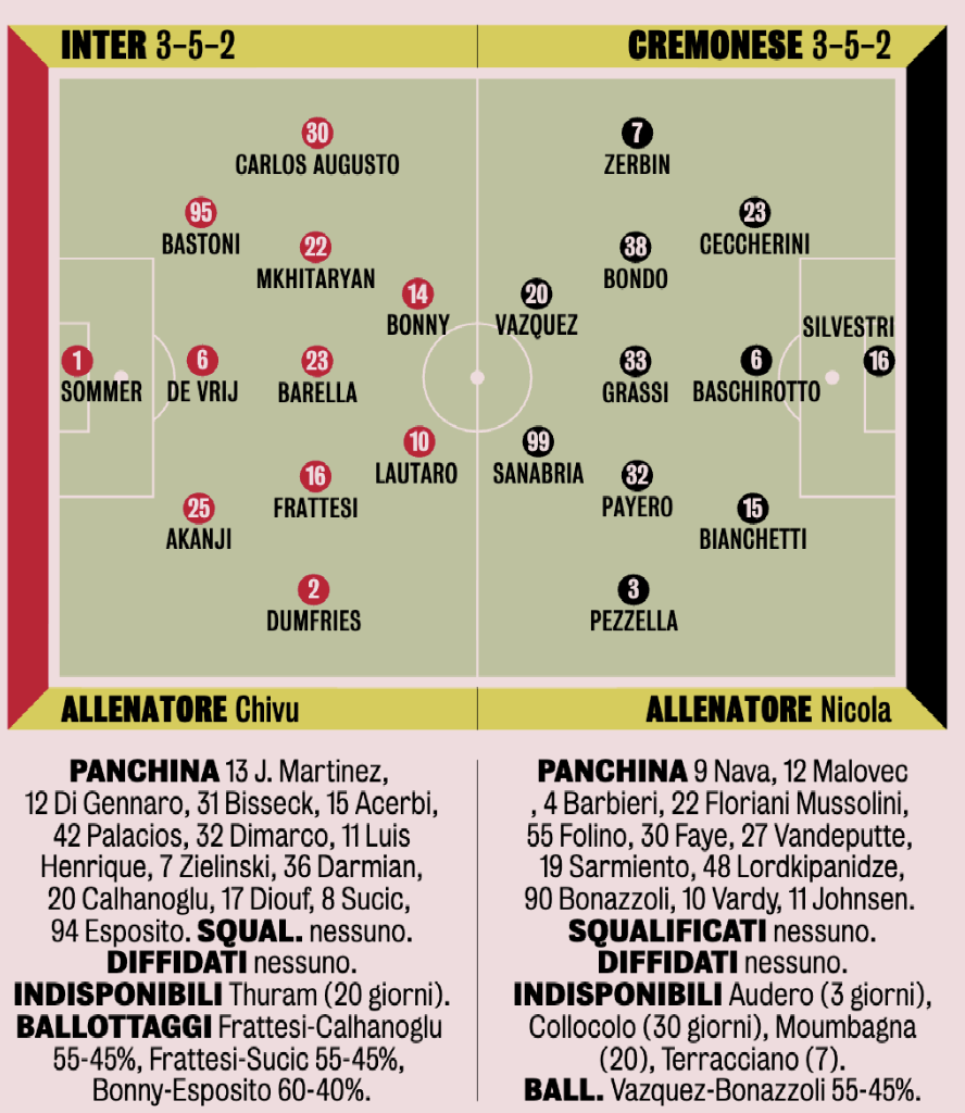 Tra i pali c’è Sommer, con Akanji e Bastoni ai lati di De Vrij e Acerbi in panchina. Sulle corsie esterne agiranno Dumfries e Carlos Augusto, mentre in mezzo in via precauzionale Calhanoglu è pronto ad accomodarsi in panchina, con Barella in regia e Frattesi e Mkhitaryan ai suoi lati. In avanti tocca a Bonny far coppia con Lautaro, con Pio Esposito pronto alla staffetta.