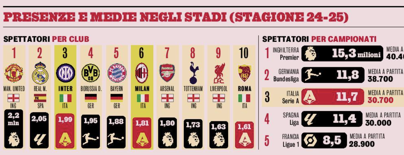 "Il tempio del calcio mondiale resta Wembley, è come quei film d’autore senza epoca, ma al botteghino il grande successo dell’ultima stagione è San Siro. Milano batte tutti. Nel 2024-25, tra campionati, coppe nazionali e coppe europee, ha staccato oltre tre milioni e ottocentomila biglietti, con l’Inter in leggero vantaggio sul Milan (quasi due milioni totali contro uno e otto). Cifre straordinarie che confermano il trend: rispetto agli anni più bui, oggi gli stadi italiani reggono il confronto con quelli spagnoli, solo Inghilterra e Germania viaggiano su cifre irraggiungibili. Inter (terza in Europa per dati complessivi) e Milan (sesto) trascinano il sistema, ma nella Top Ten c’anche la Roma grazie all’affetto dei suoi tifosi", scrive La Gazzetta dello Sport.