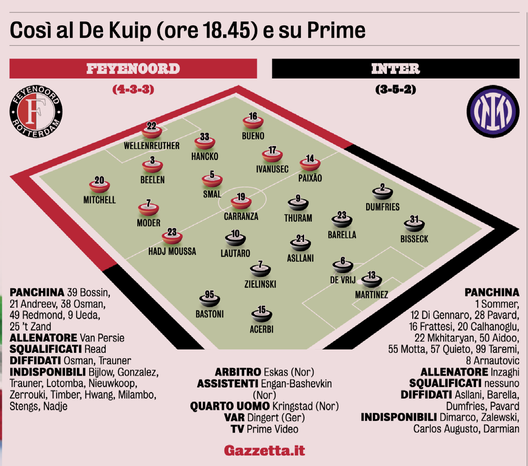 In attacco tutto lascia pensare che Inzaghi confermi la ThuLa. Anche se Lautaro viene da un tour de force di partite e il francese non è ancora al massimo della condizione. In corsa c'è Taremi che sembra il favorito davanti in caso Inzaghi decidesse di lasciare a riposo uno dei due titolari.