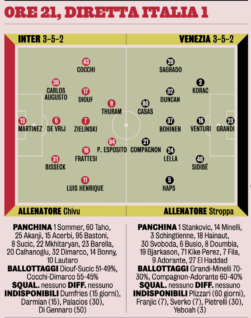 Dopo la vittoria col Pisa, l'Inter sarà in campo questa sera in Coppa Italia a San Siro con il Venezia. Chivu farà turnover e sarà anche l'occasione per vedere qualcuno di nuovo.