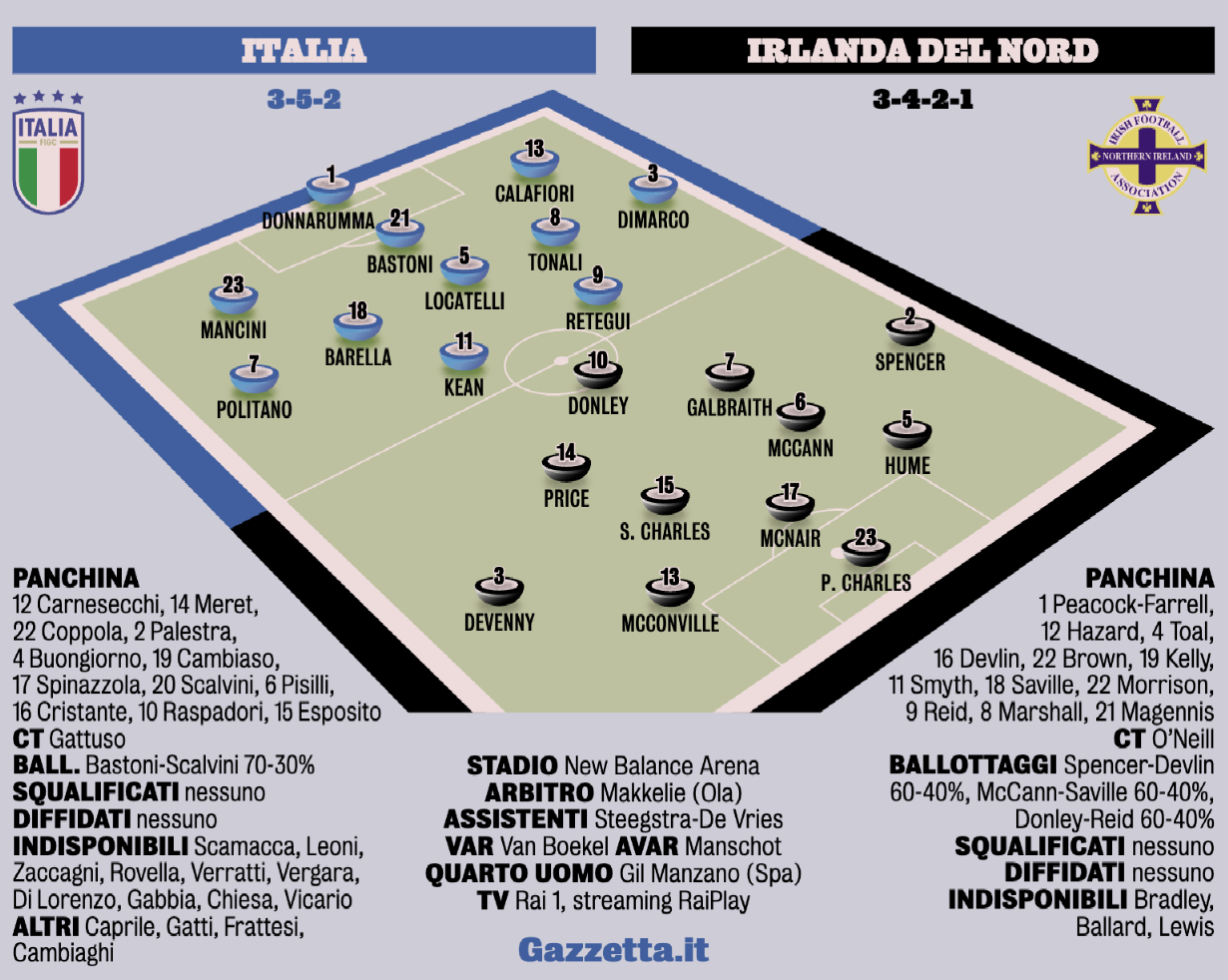 "A centrocampo Locatelli davanti alla difesa con Barella e Tonali mezzali: probabile che l’ex milanista si lanci nelle solite incursioni lasciando l’interista in posizione più equilibrata. Sulla fascia sinistra c’è Dimarco, a destra Politano che, parole del ct, non ha più problemi. In caso negativo, da esterno giocherebbe Palestra che il ct ha fortemente voluto: sarebbe un debutto quasi come quello di Cabrini in Italia-Francia 2-1 prima partita del Mondiale ’78. In attacco Kean-Retegui, ma sicuramente Pio Esposito troverà spazio a partita in corso", aggiunge il quotidiano.