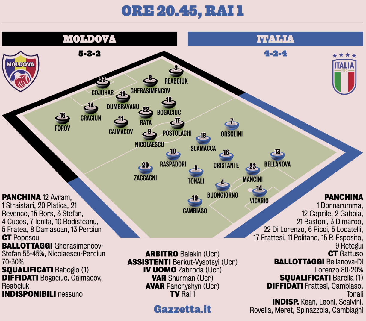 "Esperimento interessante, come quelli in difesa dove Vicario, per turnover, sostituisce Donnarumma e, per evitare problemi con la Norvegia, giocheranno anche Bellanova, Mancini, Buongiorno e Cambiaso, almeno così pare. L’altra preoccupazione sono infatti i cartellini gialli: Tonali e Cambiaso, diffidati, vanno in campo stasera e saltano Haaland perché, se in Moldova non prendono un “giallo”, rischiano poi l’ammonizione a San Siro, il che significherebbe saltare i playoff. Anche Frattesi è diffidato, mentre Barella, squalificato, torna con la Norvegia", scrive La Gazzetta dello Sport.