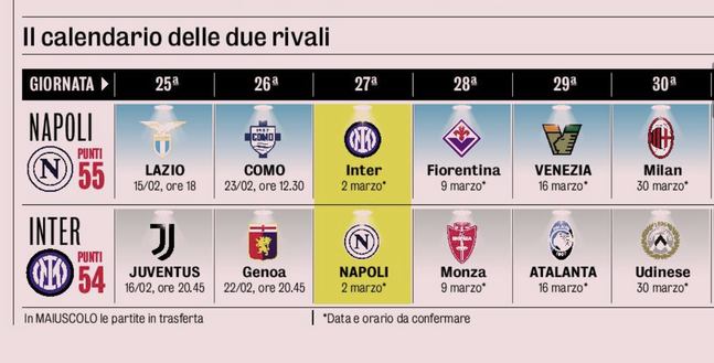 "Antonio Conte sa già quante partite dovrà preparare da qui a fine stagione (14) mentre Simone Inzaghi insegue il sogno europeo ed è ancora dentro in Coppa Italia: la forbice va da un minimo di 17 a un massimo di 25 incontri. Non siamo tra quelli che attribuiscono per principio alle coppe un’incidenza negativa sulla volata scudetto. Possono togliere qualcosa sul piano della freschezza, ma possono anche aggiungere sul piano dell’entusiasmo e della convinzione. Il vero problema sono gli infortuni, ma ci si può far male anche in allenamento o giocando solo una volta alla settimana, come dimostrano le assenze di Olivera e Spinazzola che hanno costretto Conte a schierare contro l’Udinese Mazzocchi con esito negativo. Il vantaggio del Napoli sta nel poter preparare una partita in 5-6 giorni e non in 2-3. Ma Inzaghi ha una rosa più profonda, più strutturata e più abituata a primavere calde: volata scudetto persa con il Milan nel 2021-22, finale di Champions e rincorsa al quarto posto nel 2022-23, apoteosi tricolore nel 2023-24. Il Napoli due anni fa chiuse il discorso scudetto in pieno inverno: da marzo l’argomento più trattato a Castel Volturno era la presunta data dei festeggiamenti".