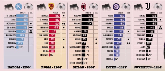 E altri titolari come Barella (168 minuti), Calhanoglu (140) e Lautaro (119) non sono stati di certo a guardare. Il più fresco tra i nerazzurri è sicuramente Frattesi, che ha giocato solo 12' e che spera di avere più spazio con l'Inter.