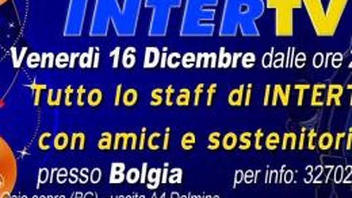 Venerdi 16 Dicembre a partire dalle ore 21:00 presso la discoteca Bolgia (Dalmine - BG) si terrà la festa di Natale di INTERTV.La televisione tematica nerazzurra, visibile sul canale 676 del digitale terrestre, ha organizzato questo grande evento per scambiarci gli auguri e passare una bella serata tra amici interisti!Saranno presenti alla serata: tutto lo staff, gli ospiti e i sostenitori. Durante la serata molti spettacoli di animazione e tante sorprese!Oltre al vasto buffet, ci saranno spettacoli di cabaret tra cui : Didi Mazzilli direttamente da Colorado Café e uno con Drag Queen.Avrete inoltre la possibilità di acquistare le Polo e le Felpe firmate INTERTV!!! Vi aspettiamo numerosi...ALLA GRANDE!!!La discoteca è in Via Vaccarezza, 8 Osio Sopra (BG) autostrada A4 MI-VE, uscita Dalmine.per info chiama al: 327/0257520
