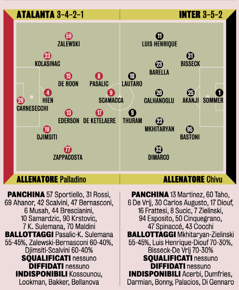 —Palladino conferma il solito 3-4-2-1: davanti a Carnesecchi ci saranno Djimsiti, in ballottaggio con Scalvini, Hien e Kolasinac. A destra tocca a Zappacosta, visto l'infortunio di Bellanova, mentre sulla corsia mancina Zalewski è leggermente in vantaggio su Bernasconi per affrontare la sua ex squadra. In mediana De Roon-Ederson. Dietro a Scamacca i dubbi maggiori di Palladino: De Ketelaere è sicuro di una maglia, con lui Pasalic parte un pochino avanti a Sulemana.