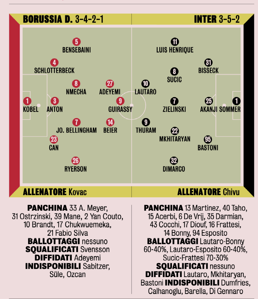 "Niente calcoli insomma, da una parte e dall’altra. Chivu potrebbe gestire Lautaro, per la stanchezza e soprattutto per la diffida, ma «lui non vuole riposare...». E comunque non sta meditando ribaltoni nella formazione di partenza: l’infortunio mattutino di Barella gli toglie i dubbi a centrocampo, già privato da settimane di Calhanoglu. Davanti invece chiede una notte da campione a Marcus Thuram, che non segna in Champions dalla prima giornata, cioè dalla doppietta di Amsterdam il 17 settembre, e che a Dortmund ha perso quattro volte su quattro nei suoi anni in Bundesliga con l’altro Borussia, il Mönchengladbach. Pio e Bonny spingono con la loro freschezza: Thuram ha bisogno di ristabilire le distanze dal momento che nelle ultime sei partite è andato tre volte in panchina", scrive La Gazzetta dello Sport.