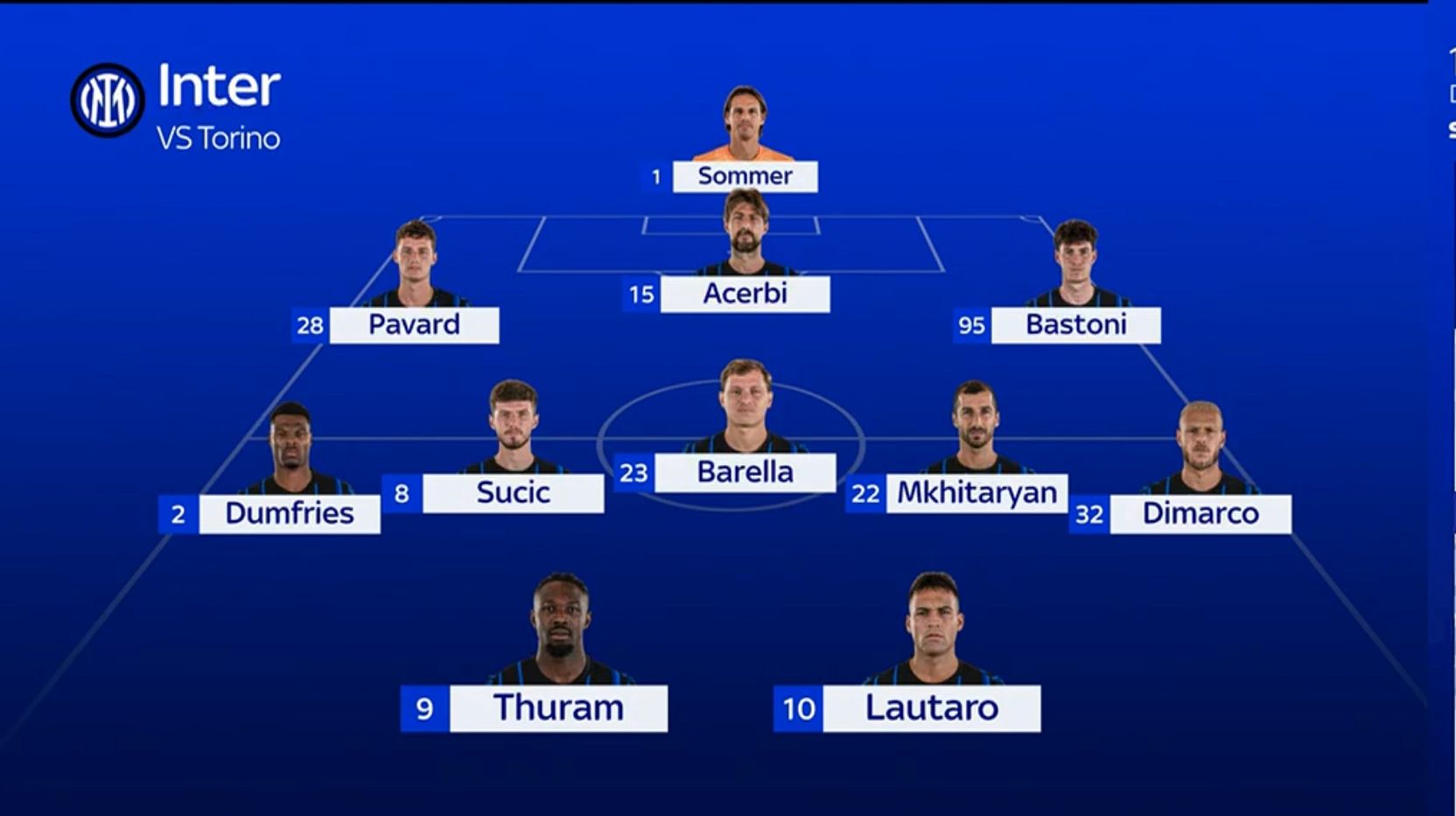 Dumfries e Dimarco sono i due esterni, mentre nel centrocampo a tre spazio a Sucic, Barella - che Sky posiziona come regista - e Mkhitaryan visto che Hakan Calhanoglu è squalificato.