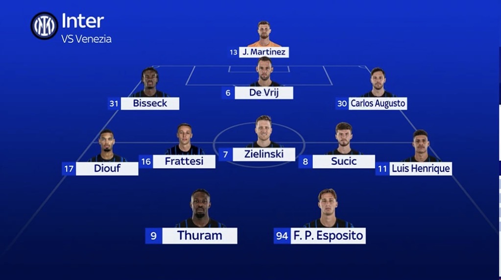 Davanti al portiere spagnolo dovrebbero esserci Bisseck, De Vrij e Carlos Augusto come braccetto sinistro. In mezzo riposano sia Calhanoglu che Barella. In cabina di regia dovrebbe toccare a Zielinski con Frattesi e Sugi al suo fianco. Se così fosse sulle fasce potremmo vedere a destra Diouf e a sinistra Luis Henrique. C’è anche l’ipotesi Cocchi a sinistra dal 1’ con Diouf al posto di Sucic. Davanti la coppia Esposito-Thuram.