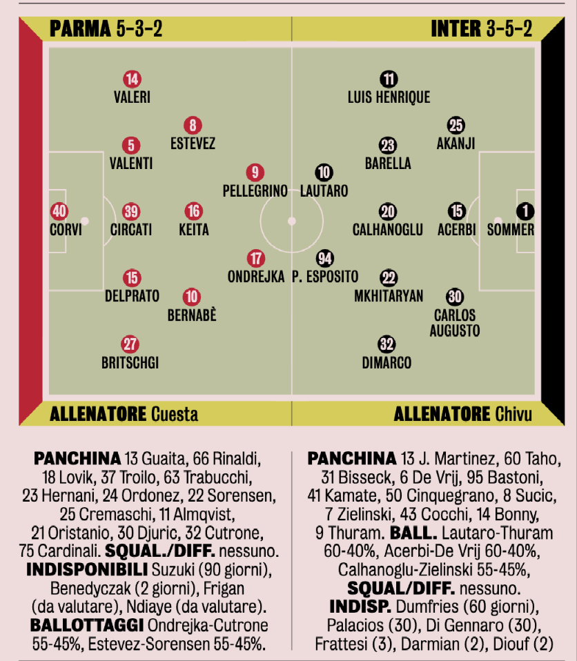 —Sulle fasce scelte obbligate per Chivu: a destra c'è il solo Luis Henrique, viste le assenze di Darmian e Dumfries. Il brasiliano è confermato dal 1'. A sinistra, con il probabile schieramento di Carlos Augusto in difesa, toccherà ancora a Dimaro. In mezzo al campo potrebbe esserci un turno di risposo per Zielinski o Calhanoglu (più probabile che resti fuori inizialmente il polacco). Potrebbe tornare titolare Mkhitaryan col turco e Barella.