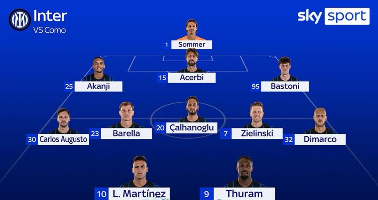 Secondo Sky Sport, "Ancora qualche dubbio da sciogliere per Chivu, ma Luis Henrique, Bisseck e Bonny partono indietro nei ballottaggi; Previsti due cambi rispetto alla formazione vista a Pisa, con il ritorno dal 1' di Carlos Augusto e Zielinski; Al fianco di Lautaro dovrebbe esserci ancora Thuram, reduce dalla doppietta in Coppa Italia contro il Venezia".