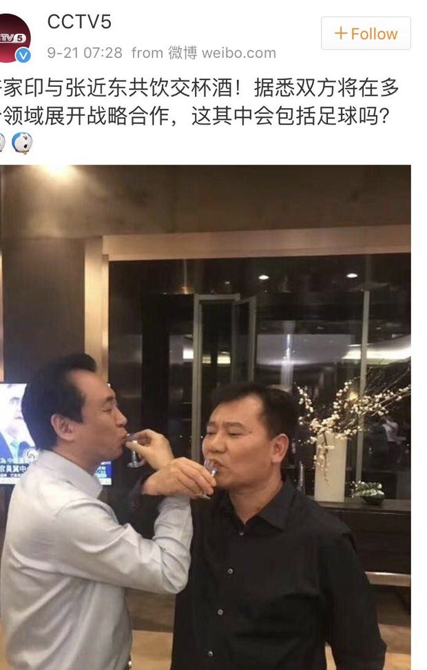 Zu Jiayin e Zhang Jindong hanno stretto un accordo di cooperazione strategica tra le due aziende di cui sono a capo, il Suning Group e l'Evergrande Group. L'annuncio è della CCTV, la tv governativa cinese. Non è stato chiarito in che cosa consista questo accordo ma nell'annuncio la tv di stato inserisce anche un possibile riflesso sul mondo del calcio: "E' coinvolto anche il calcio nell'intesa tra i due gruppi?", si legge nel messaggio postato su Weibo dall'emittente. L'intesa potrebbe riguardare tanto le squadre cinesi dei due gruppi, il Jiangsu e il Guanzhou, quanto l'Inter, ancora alla ricerca di un partner che sostituisca Erick Thohir, che ha già manifestato l'intenzione di defilarsi per occuparsi degli Asian Games. Alla riunione nella sede di Suning, infatti, hanno partecipato anche i dirigenti del settore sportivo di Suning, il Suning Sports Group.
