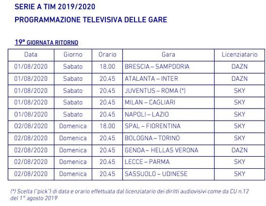 La Lega Calcio ha pubblicato orari e programmazione tv della 19 giornata di ritorno del campionato di Serie A 2019-2020. E l'Inter giocherà contro l'Atalanta alle 20.45 di sabato su Dazn. Ecco la tabella:
