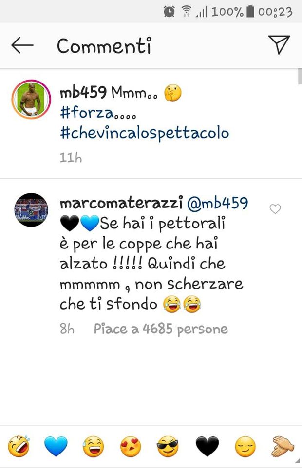 I cuori sono nerazzurri e poi Materazzi scrive: «Hai i pettorali per le coppe che hai alzato!! Quindi mmm, non scherzare che ti sfondo». Ci piace, bravo Marco. Come si fanno ad avere certi dubbi? Balotelli non ha risposto, è arrivata solo la replica del fratello Enock che scrive Forza Milan con i cuoricini rossoneri.