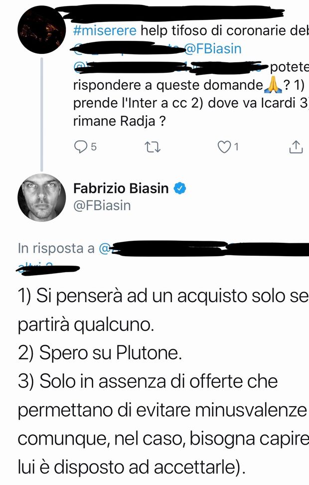 Fabrizio Biasin viene spesso tirato in causa sui social in merito ai temi più classici nell'ambito del calciomercato nerazzurro: da Icardi a Nainggolan sono tante le domande dei tifosi. Ad un tifoso che gli chiedeva risposte su tre problematiche attuali in casa Inter ha risposto così: "Chi prende l'Inter a centrocampo? Si penserà ad un acquisto solo se partirà qualcuno. Dove va Icardi? Spero su Plutone. Radja rimane? Solo in assenza di offerte che permettano di evitare minsuvalenze (e comunque nel caso bisogna capire se lui è disposto ad accettarle)."