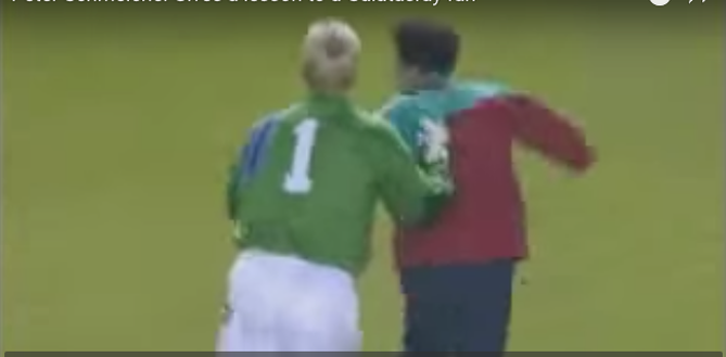 Al termine della partita di Champions League tra Galatasaray-Manchester United, un tifoso turco entra in campo e imprudentemente va dritto verso Peter Schmeichel. Il portiere afferra il tifoso e lo lancia fuori dal campo.