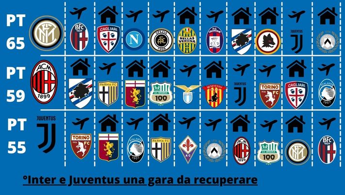 Se Inter e Milan si divideranno equamente le gare fuori casa e dentro la Juventus potrà contare su una gara in più da giocare allo Stadium. I bianconeri inoltre avranno dalla loto il fattore casalingo anche per i due scontri diretti con Milan e Inter che entrambi si disputeranno a Torino. Scontri diretti che vedranno tutte e tre le pretendenti impegnate in scontri da alta classifica per tre volte. L'Inter, da qui a fine stagione, affronterà Napoli, Roma e Juventus. I rossoneri dovranno vedersela con Lazio, Juventus e Atalanta mentre per i bianconeri ci saranno Atalanta, Milan e Inter.