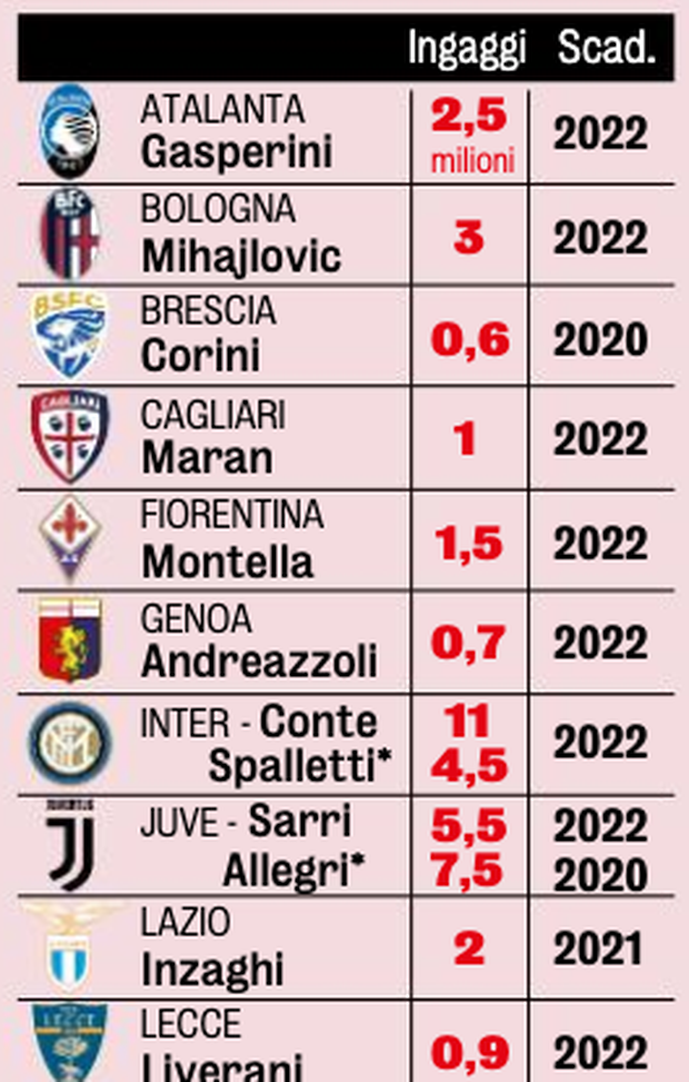 Ecco il quadro con i salari degli allenatori delle squadra di A, grafica Gazzetta: