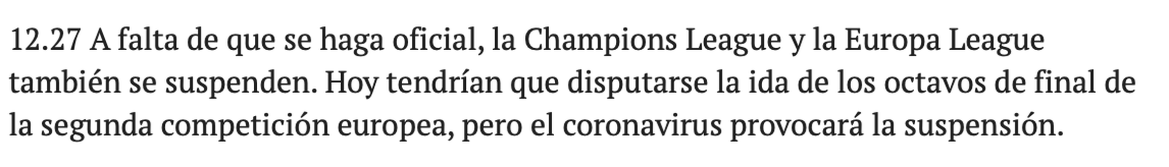 L'emergenza Coronavirus sta coinvolgendo sempre di più l'Europa intera e, di conseguenza, anche il mondo del calcio. Il Real Madrid ha annunciato la quarantena, La Liga la sospensione del campionato. L'unico organo che ancora ha in programma le sue gare è l'Uefa, ma, come annuncia Marca, è attesa oggi l'ufficialità della sospensione delle gare di Champions League e di Europa League. Oggi si sarebbero dovuto infatti disputare gli ottavi di finale di EL, tra cui Inter-Getafe, giustamente rinviata.